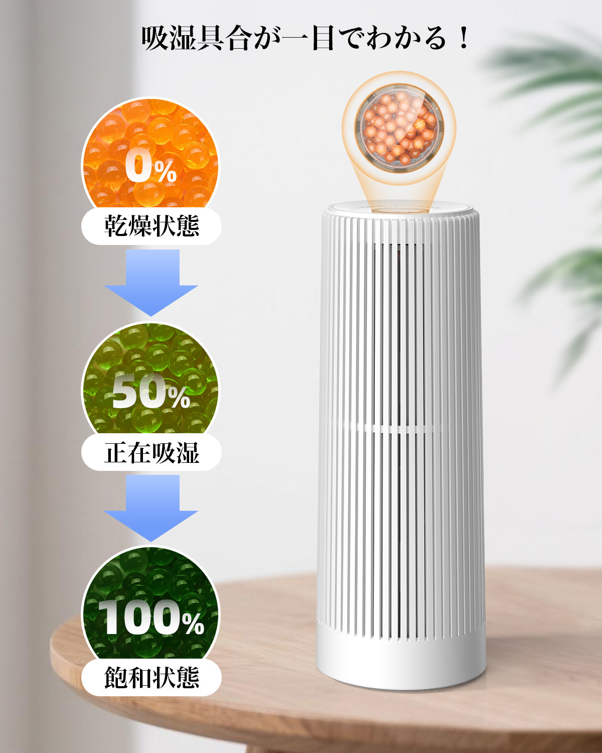• 【見える除湿で安心】透明な窓から見える色の変化で、現在の除湿状況を確認できます:オレンジ色(乾燥中)→ 緑色(湿気吸収中)→ 深い緑色(完全に水分吸収済み)。
