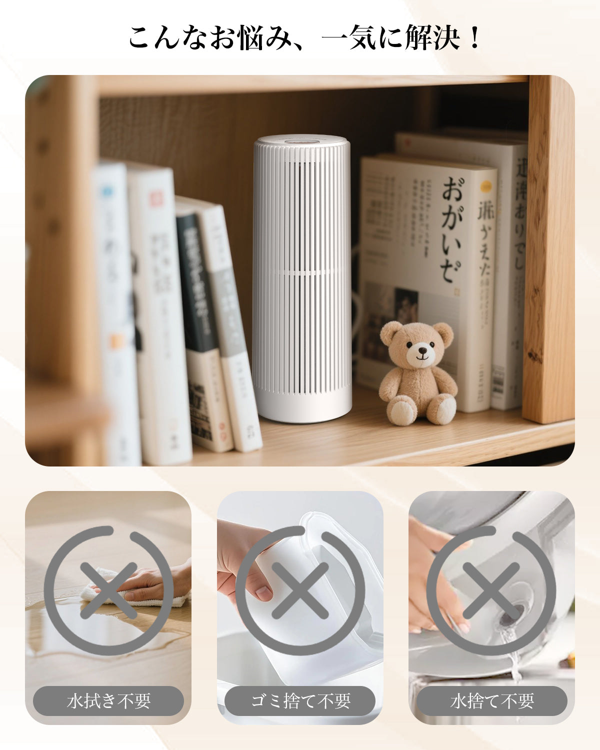 • 【お手入れ不要でラクラク】ゴミも水も出さない環境に優しい除湿機ですので、水を捨てたり、拭き取ったり、ゴミを処理したりする手間がかからず、快適にお使いいただけます。