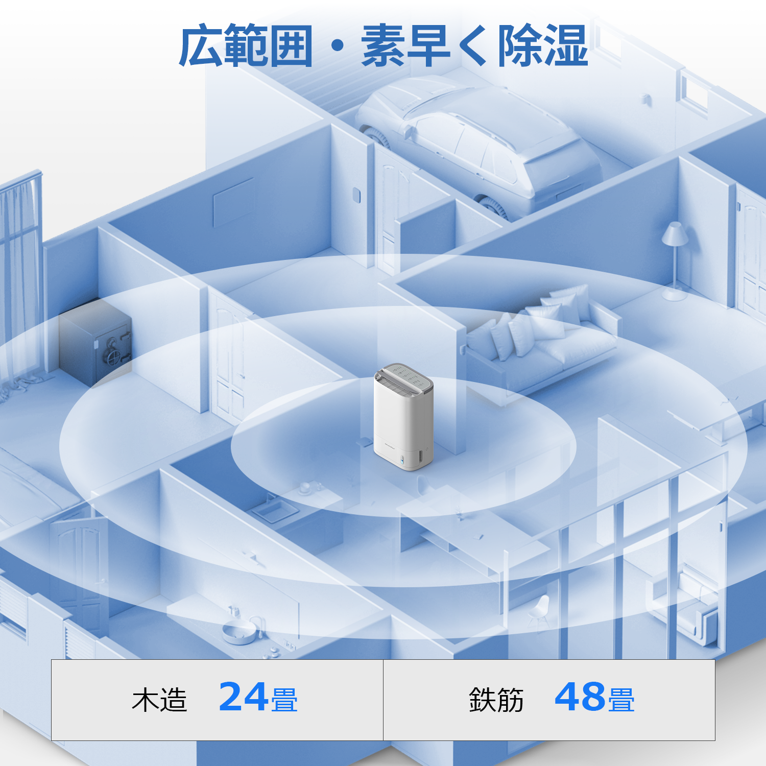- 【知能湿度センサー&入/切タイマー】湿度センサー搭載で、お好みの湿度に合わせて除湿されます。除湿モード時に、50%と60%で湿度を設定できる。設定湿度に達すると除湿を停止します。設定した湿度より高くなる場合、除湿が再開します。2·4·8時間の入/切タイマーに設定すると、時間になったら除湿機は自動的に電源オン・オフになります。お出かけの前に起動時間を設定すれば帰るとすぐ爽やかな空気を楽しめ、お休みの前に停止時間を設定すると切り忘れることなく安心して快眠できます。